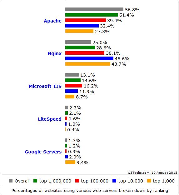 据 w3techs 在 2015 年 8 月 10 日的统计数据表明,在全球 Top 1000 的网站中,有 43.7% 的网站在使用 Nginx,这使得 Nginx 超越了 Apache,成为了高流量网站最信任的 Web 服务器足足有两年时间。已经确定在使用 Nginx 的站点有:Wikipedia,WordPress,Reddit,Tumblr,Pinterest,Dropbox,Slideshare,Stackexchange 等,可以持续罗列好几个小时,他们太多了。