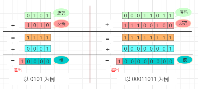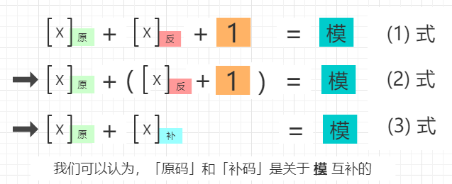 图 1.6.14.1.1:模的概念 接着,我们来验证一个结论:不管是几位的二进制数,它的 「原码」 + 「反码」 + 1 = 模。