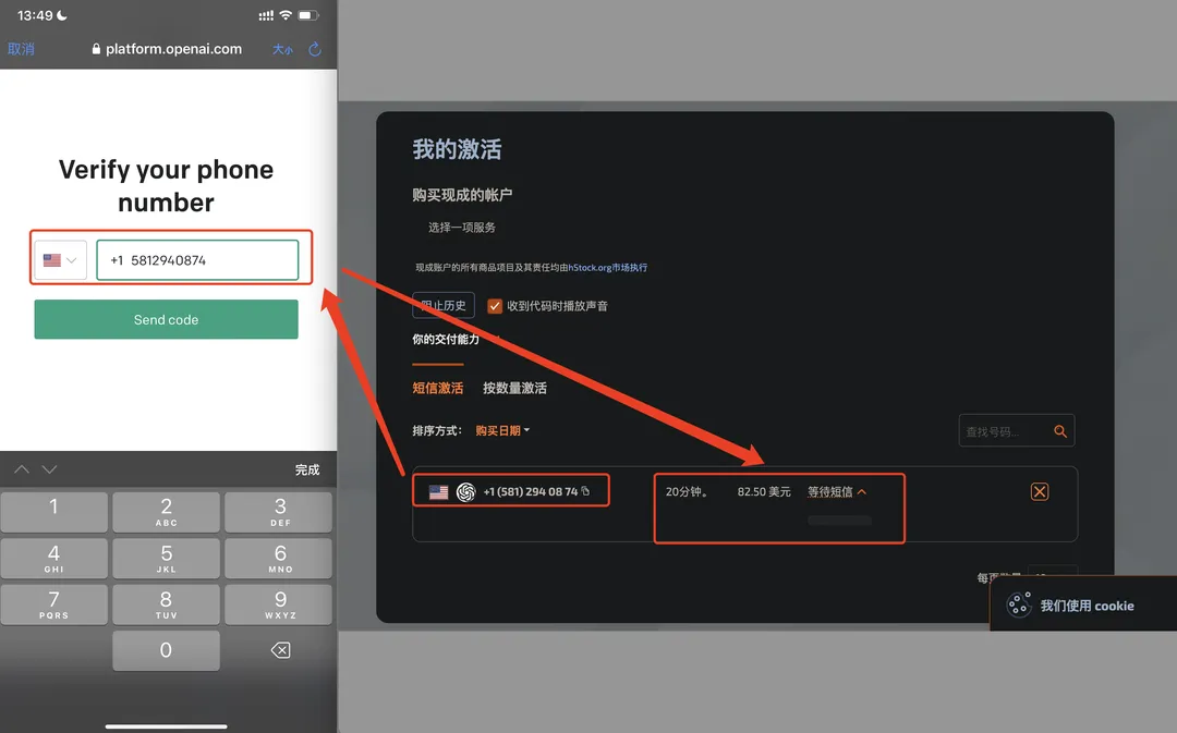 完成购买后,你将获得一个手机号码。将此号码输入到 ChatGPT 的短信验证页面,等待短信到达。注意:显示的 82.50 美元实际上是 82.5 卢布,约合人民币 6-10 元。
