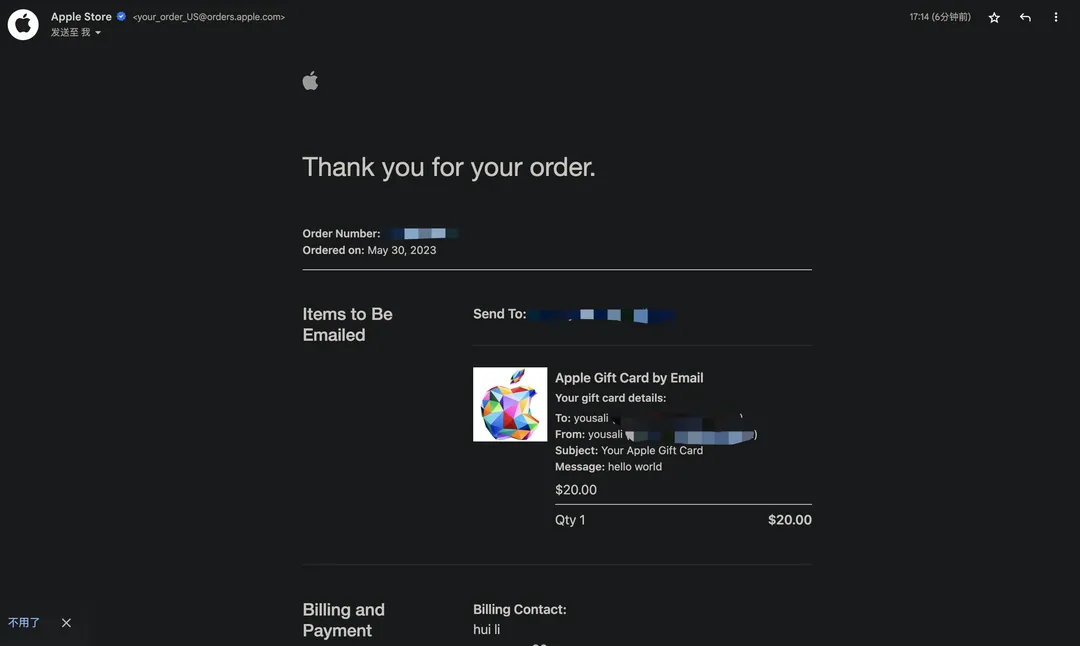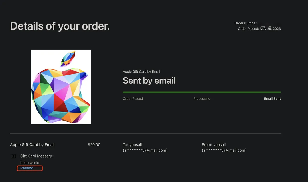 若未收到礼品卡信息,可登录并访问订单详情页面,点击 “resend” 重新发送礼品卡信息。