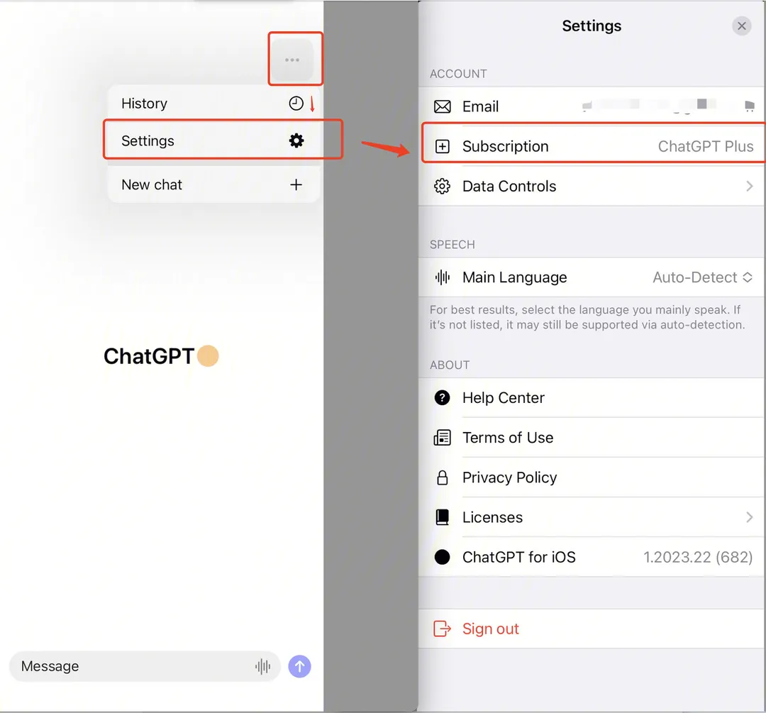 - 登录后,点击屏幕右上角的"…“按钮进入设置页面。在此你可以看到购买选项,点击即可开通 ChatGPT Plus。购买后会默认开启自动续订服务,确保账号内余额充足即可继续使用。