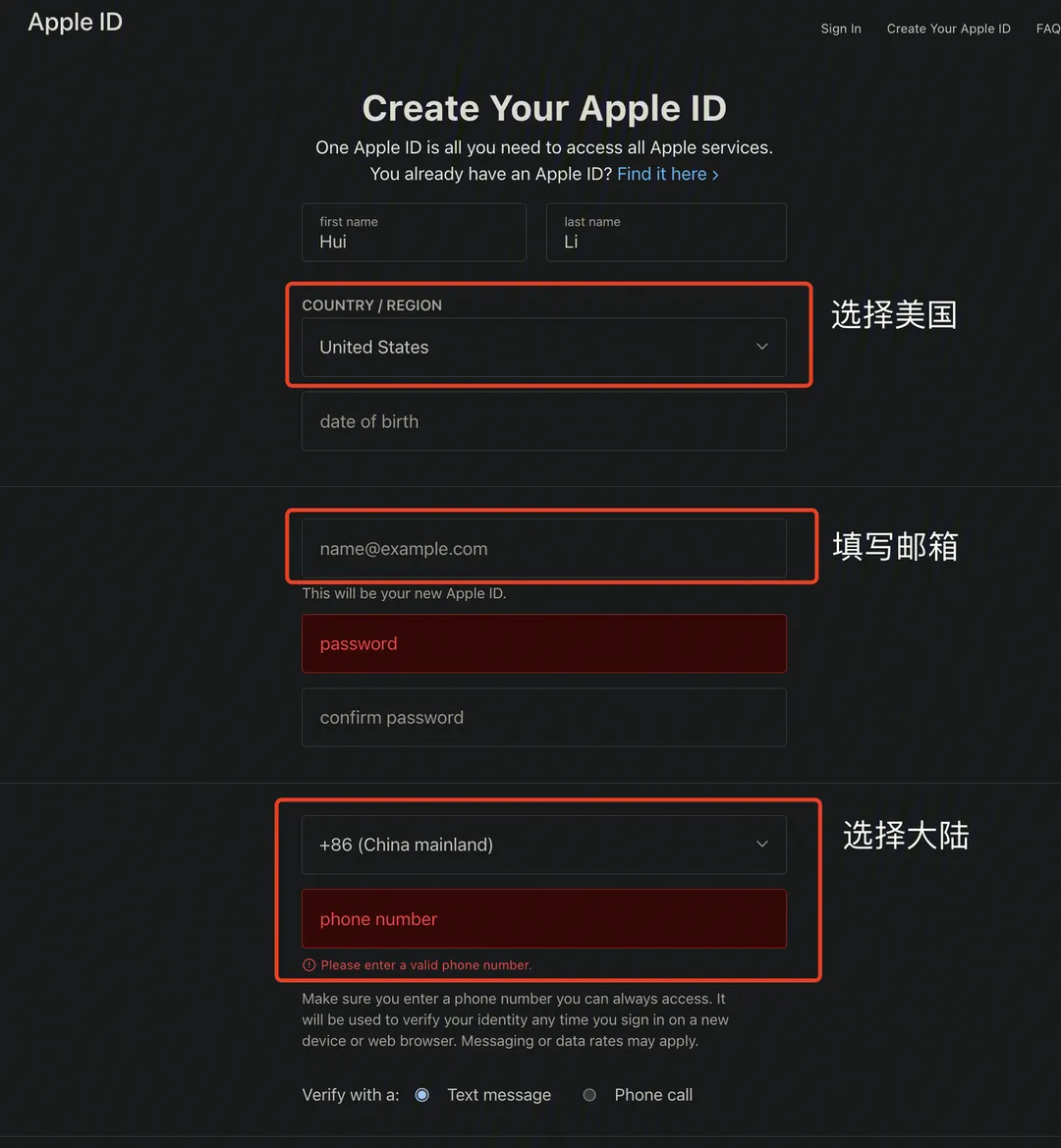 输入并验证手机号码:选择"China Mainland"作为电话区域,输入手机号并继续。你将收到验证码,输入以验证。