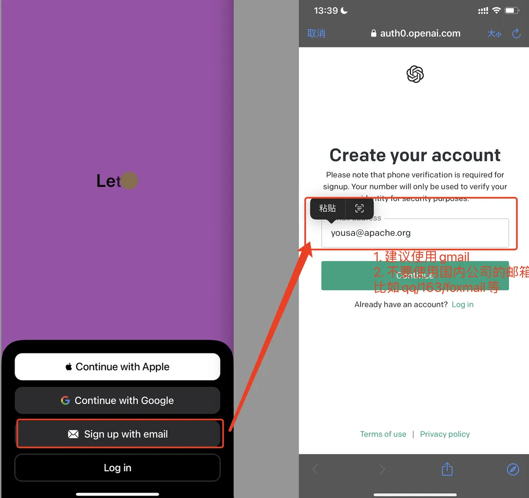 选择使用邮箱进行注册,并输入你的 gmail 地址。避免使用中国大陆的邮箱以防注册失败或账户被封禁。