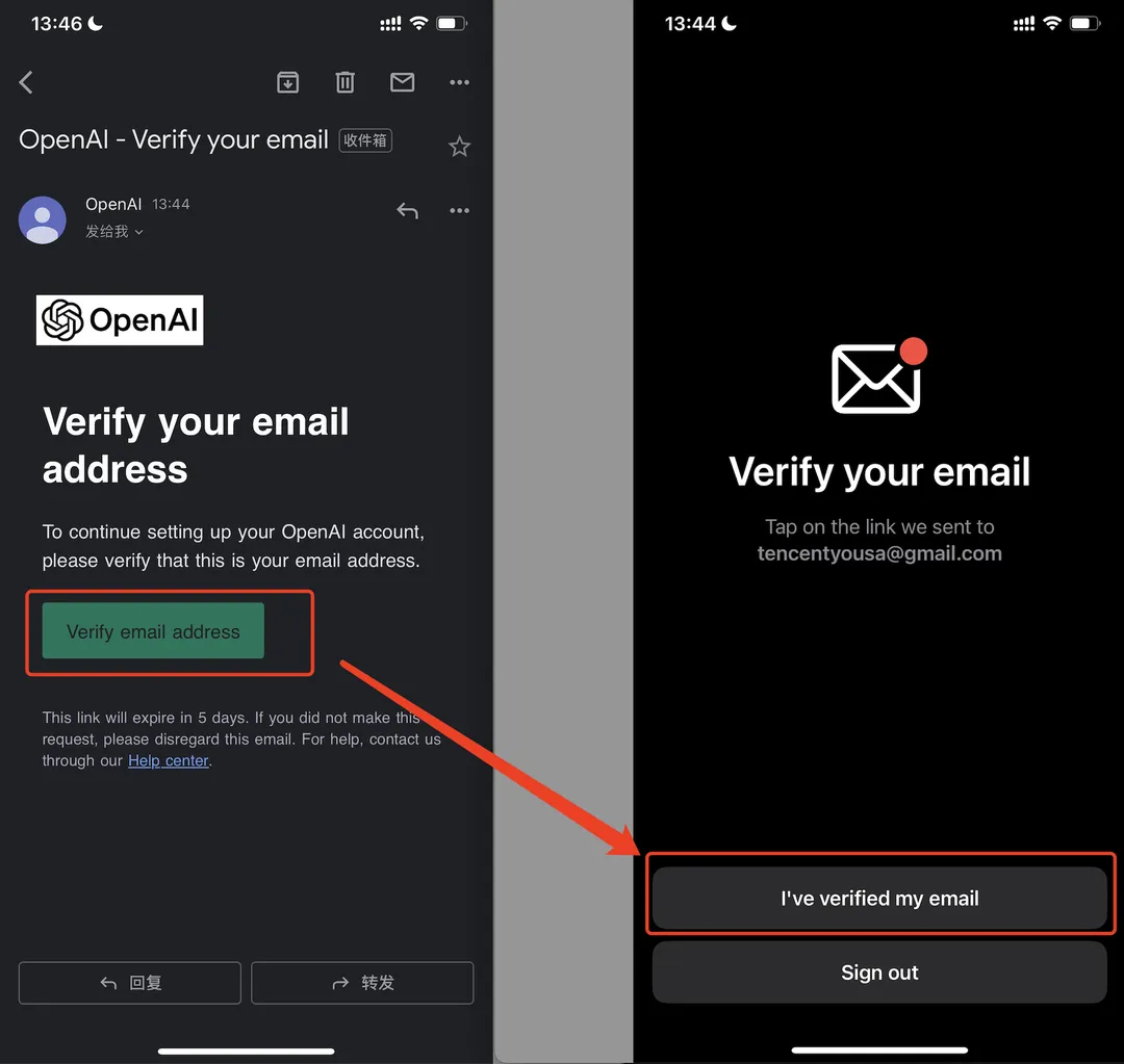在 ChatGPT 应用程序中点击"I’ve verified my email"按钮,继续注册流程。