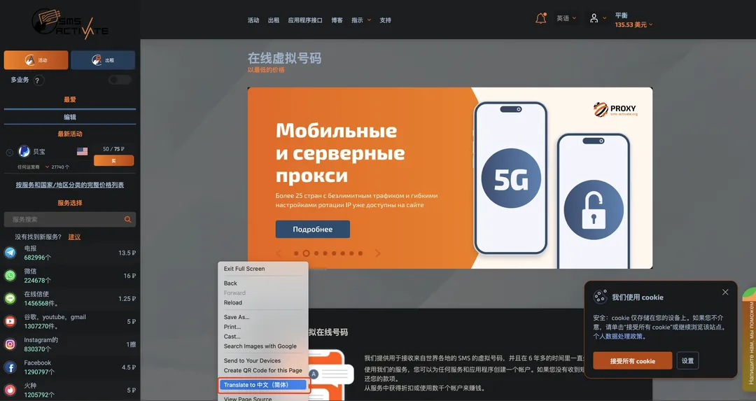 关键步骤:使用在线接码平台接收手机验证码。访问 sms-activate.org,如页面默认为俄语,可使用 Chrome 浏览器的翻译功能将其翻译为中文。